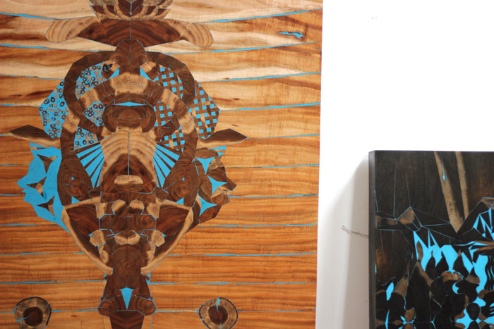 Because I build up these ‘paintings’ with small discreet pieces, I can use a wide variety of wood species, wood that a cabinetmaker or luthier would immediately reject. I’m often amused that a tiny piece of junk wood becomes precious and intrinsic to a composition; cut it just so, chisel, sand, and suddenly and ridiculously, the debris has value.